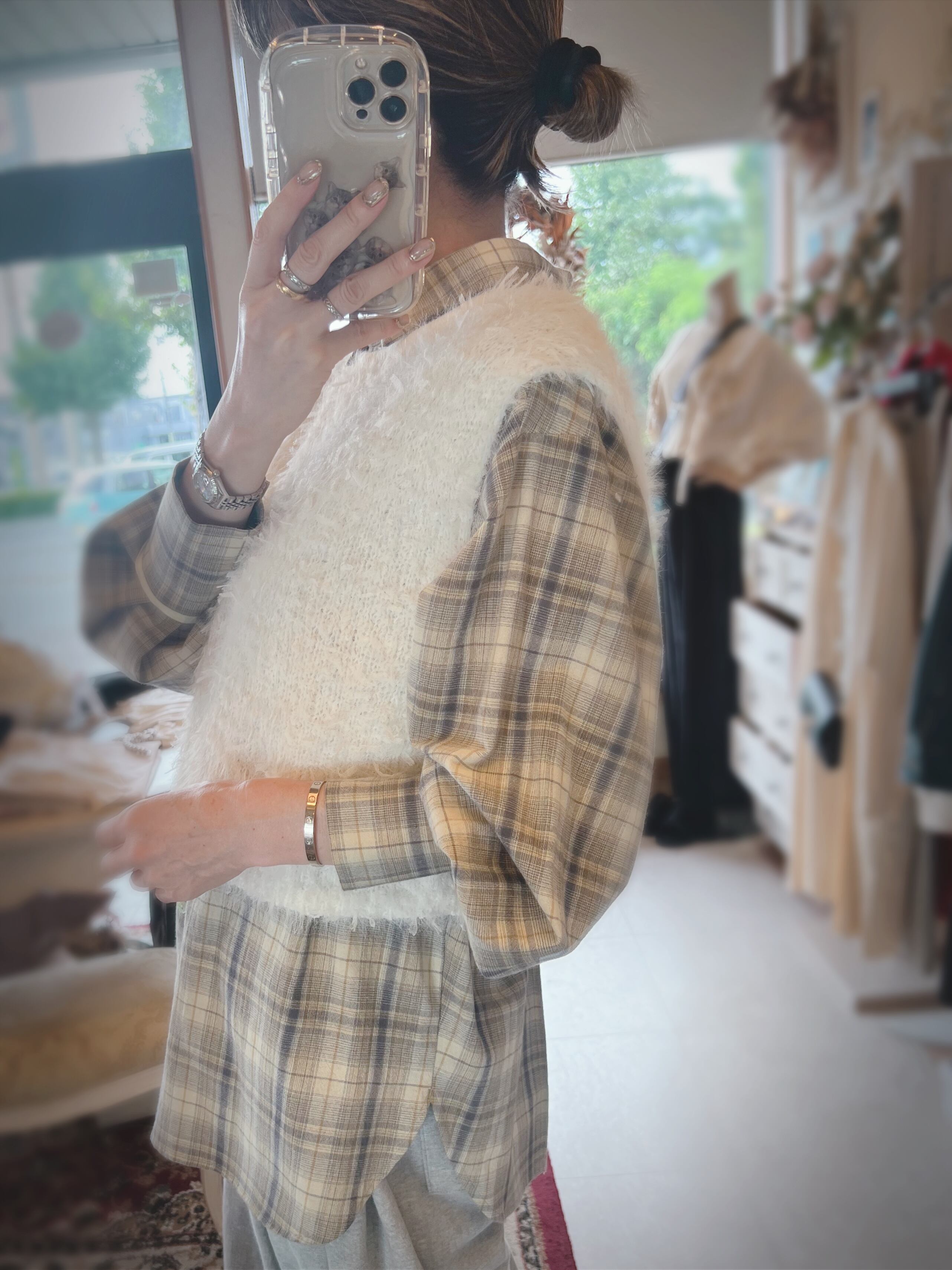 ふんわりとしたチュールと柔らかなフェザーヤーンを使用した、シンプルでありながら存在感のあるベストです。軽やかでエアリーな印象を与え、どんなスタイルにもマッチします。印象的なベースとして活躍し、着回し力も抜群です。 シルエットを美しく見せるデザインで、特別な日にもカジュアルなシーンでもお使いいただけます。 layeringしやすいので、春秋はもちろん、冬のコーディネートにもおすすめです。