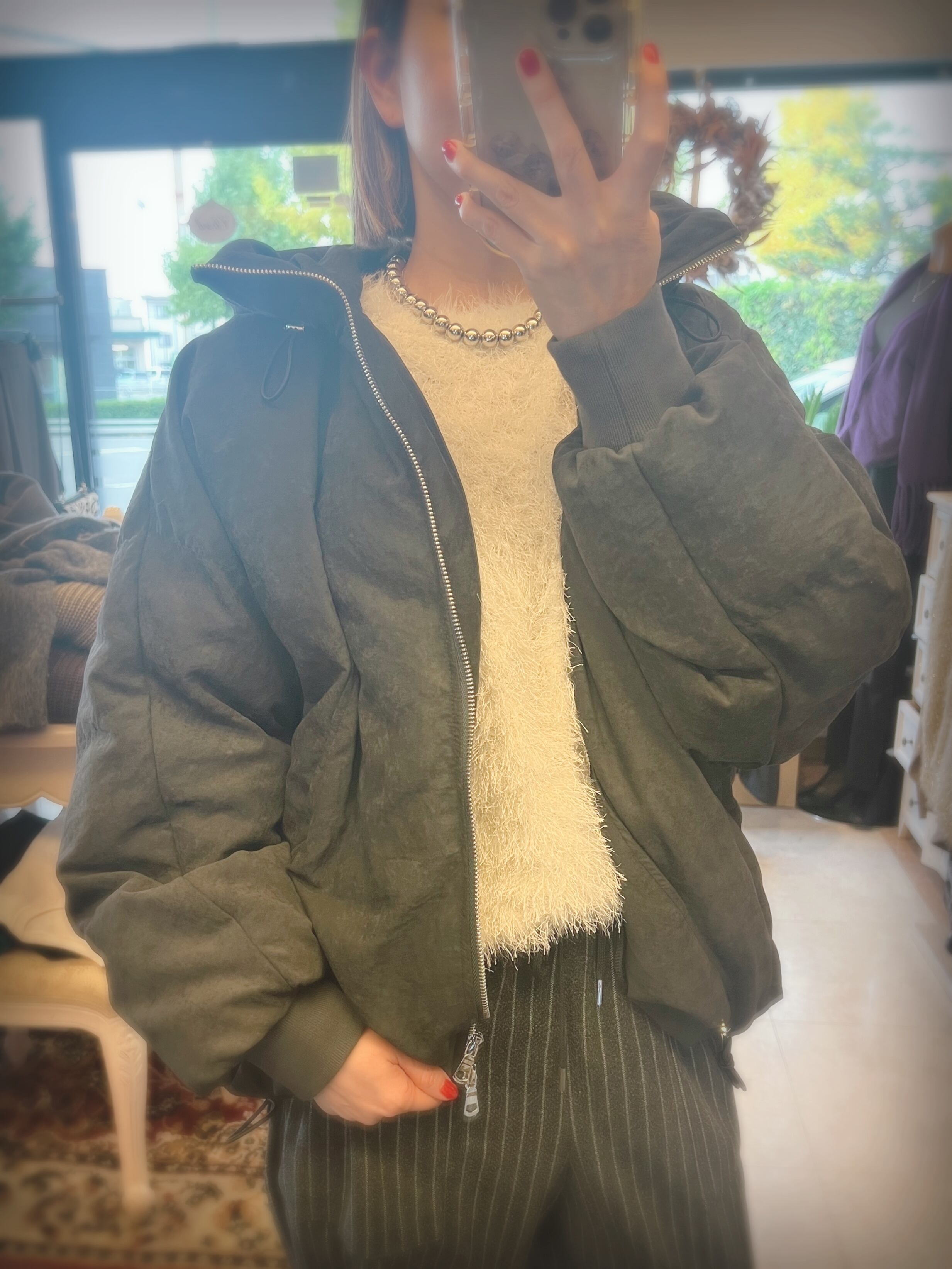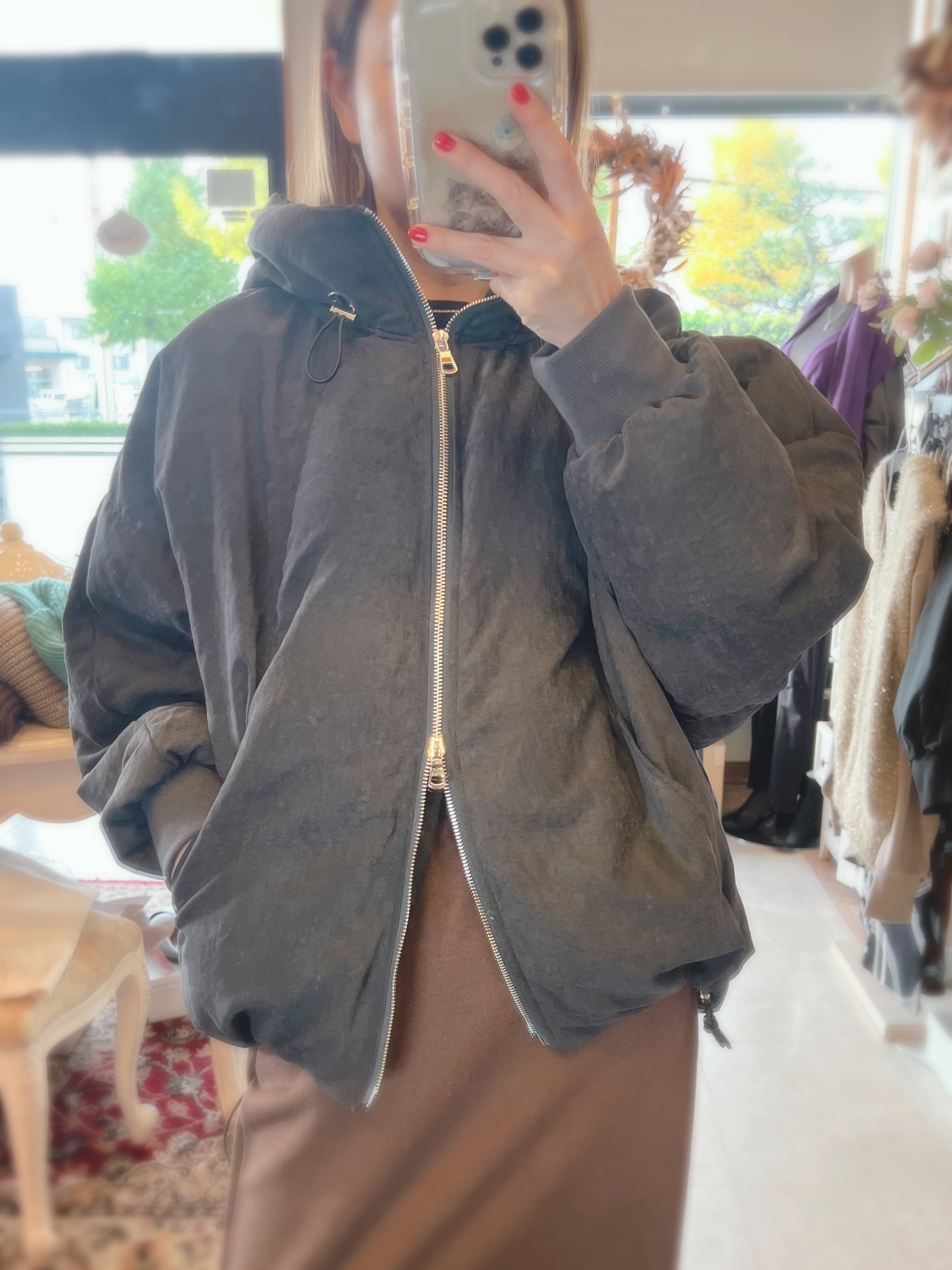 フードと首回りにボリュームを持たせることで、小顔効果も期待できます。