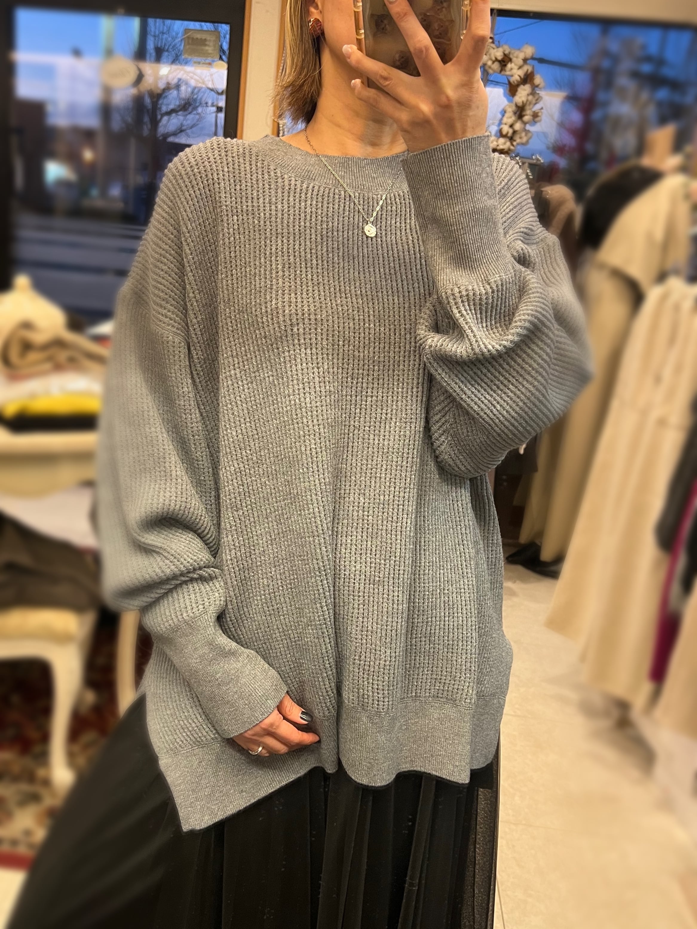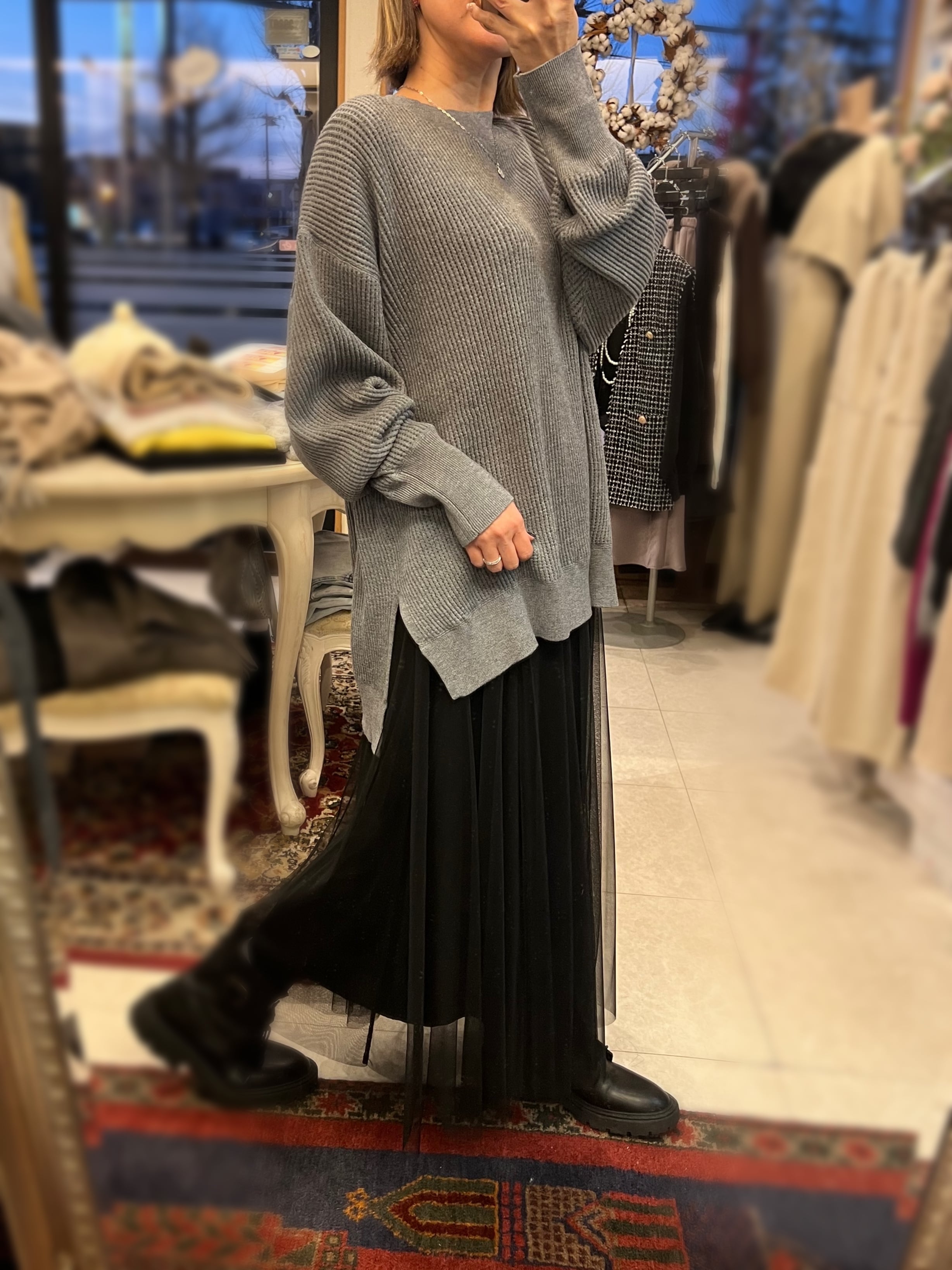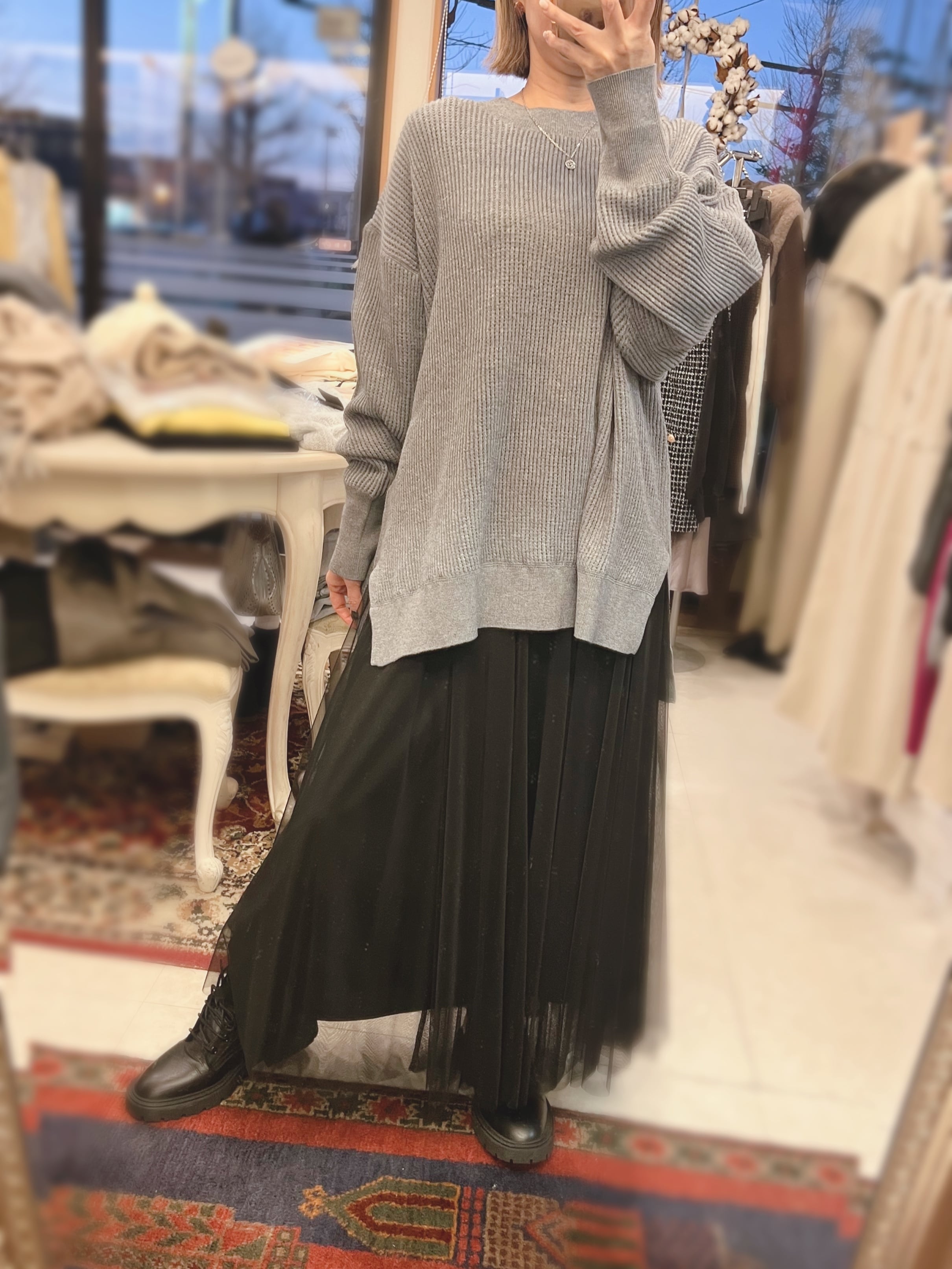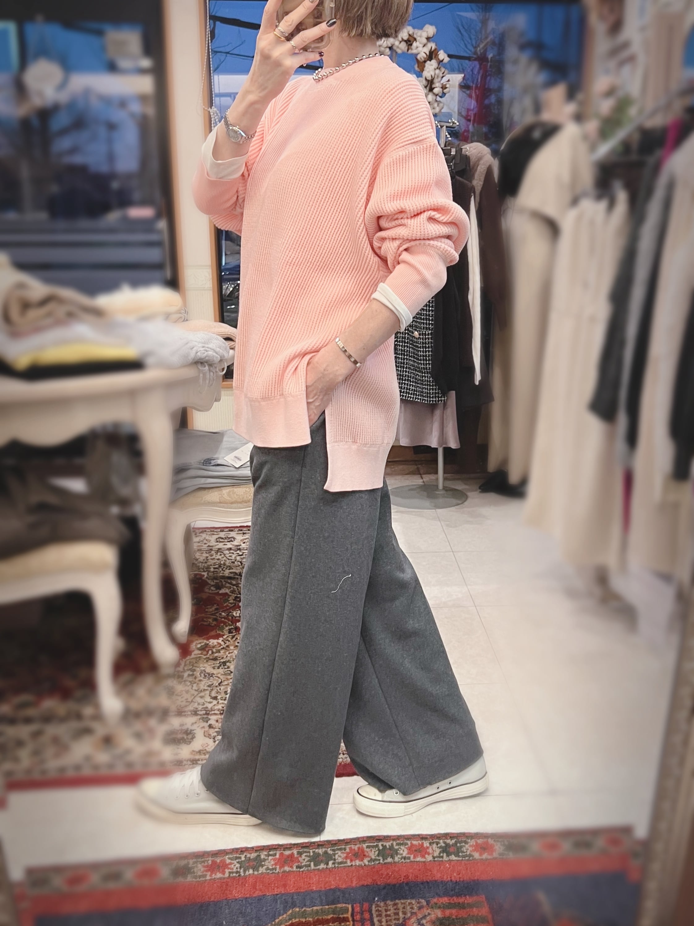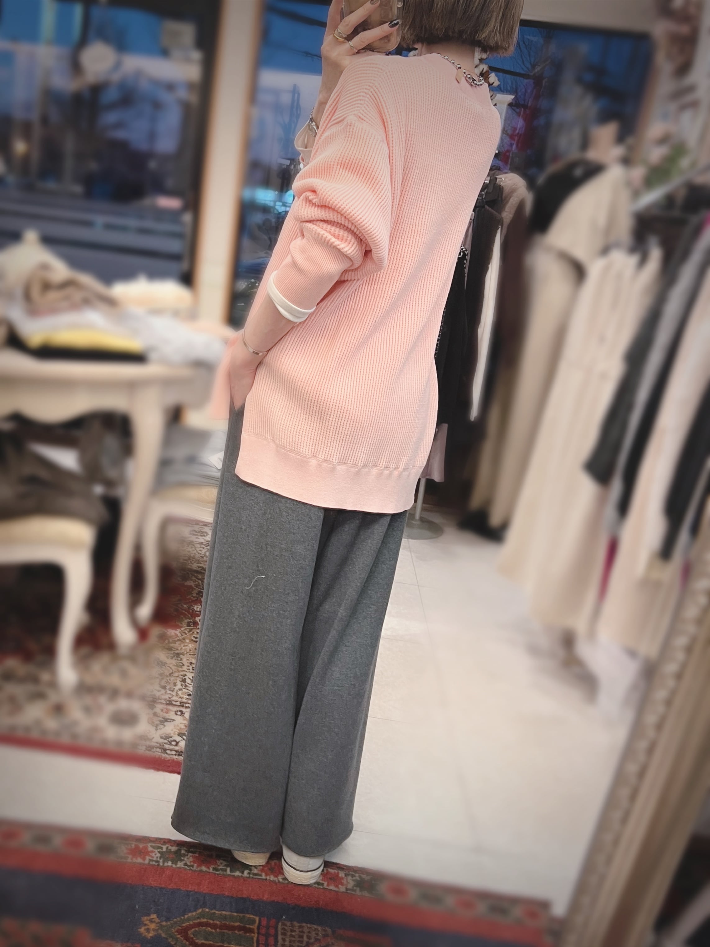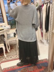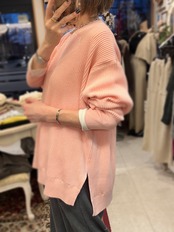 レーヨン混素材を使用しているので、とてもなめらかなタッチで、程よい落ち感が気持ち良いニットです。厚すぎない丁度良い肉感も◎。