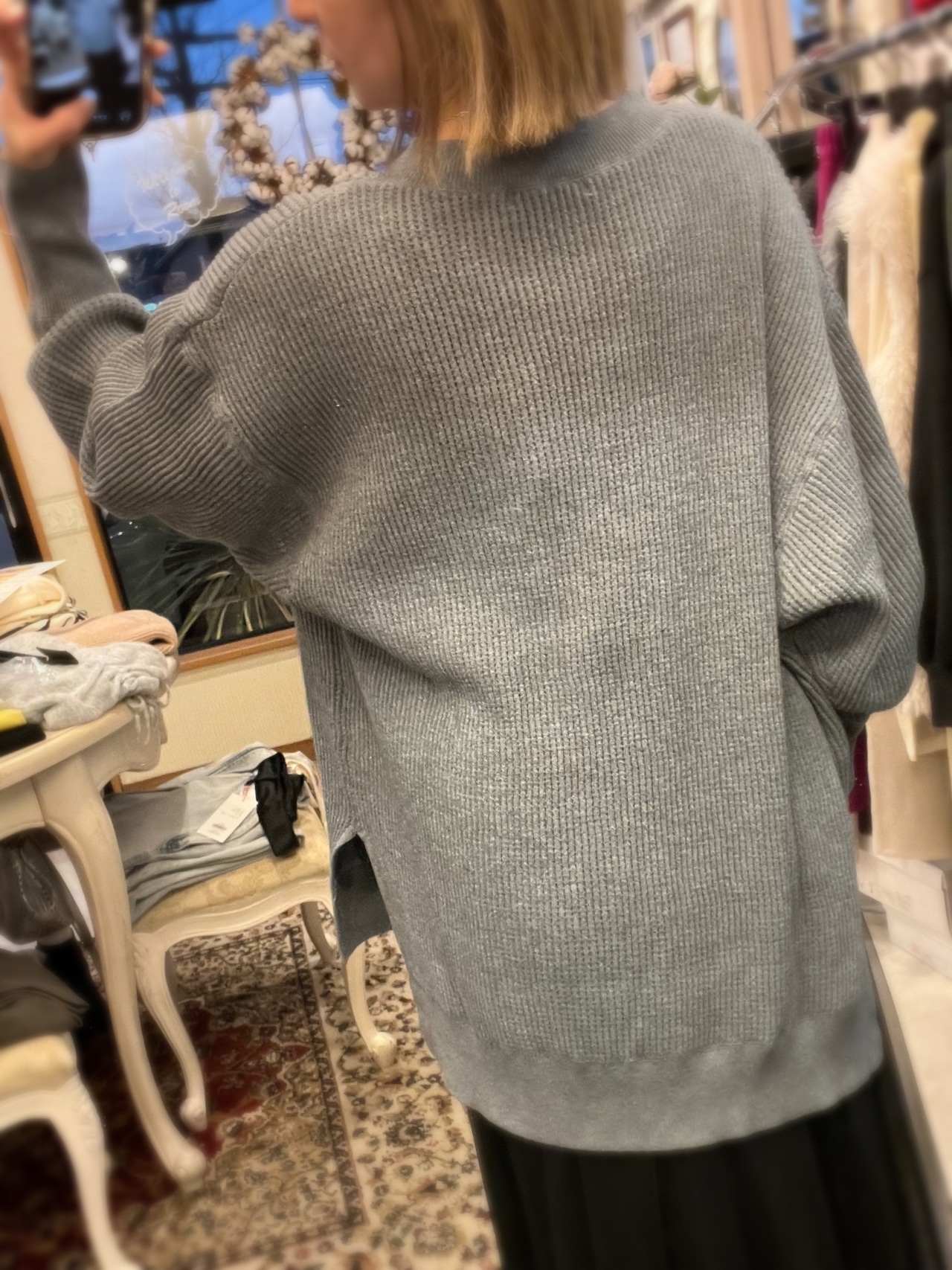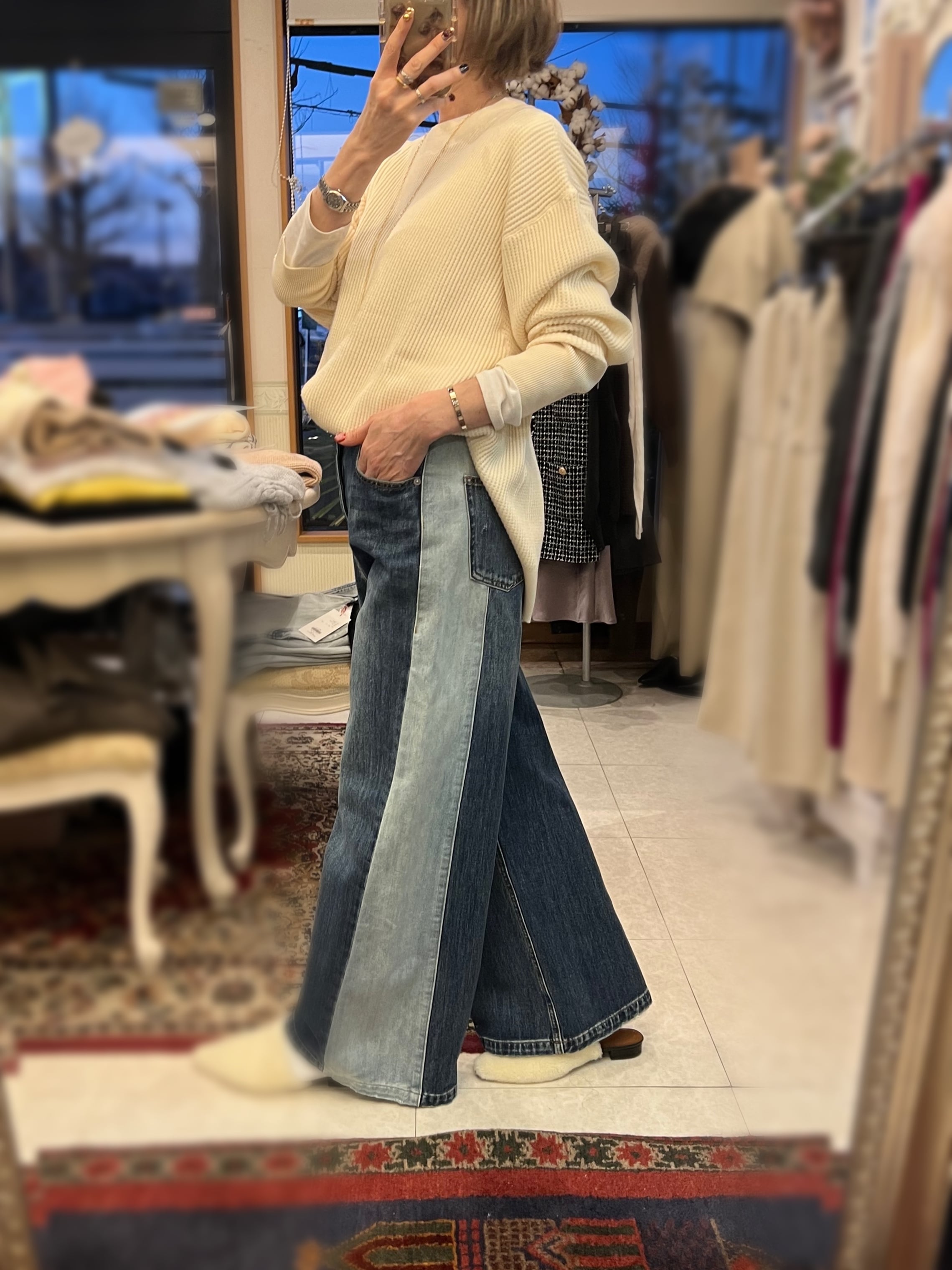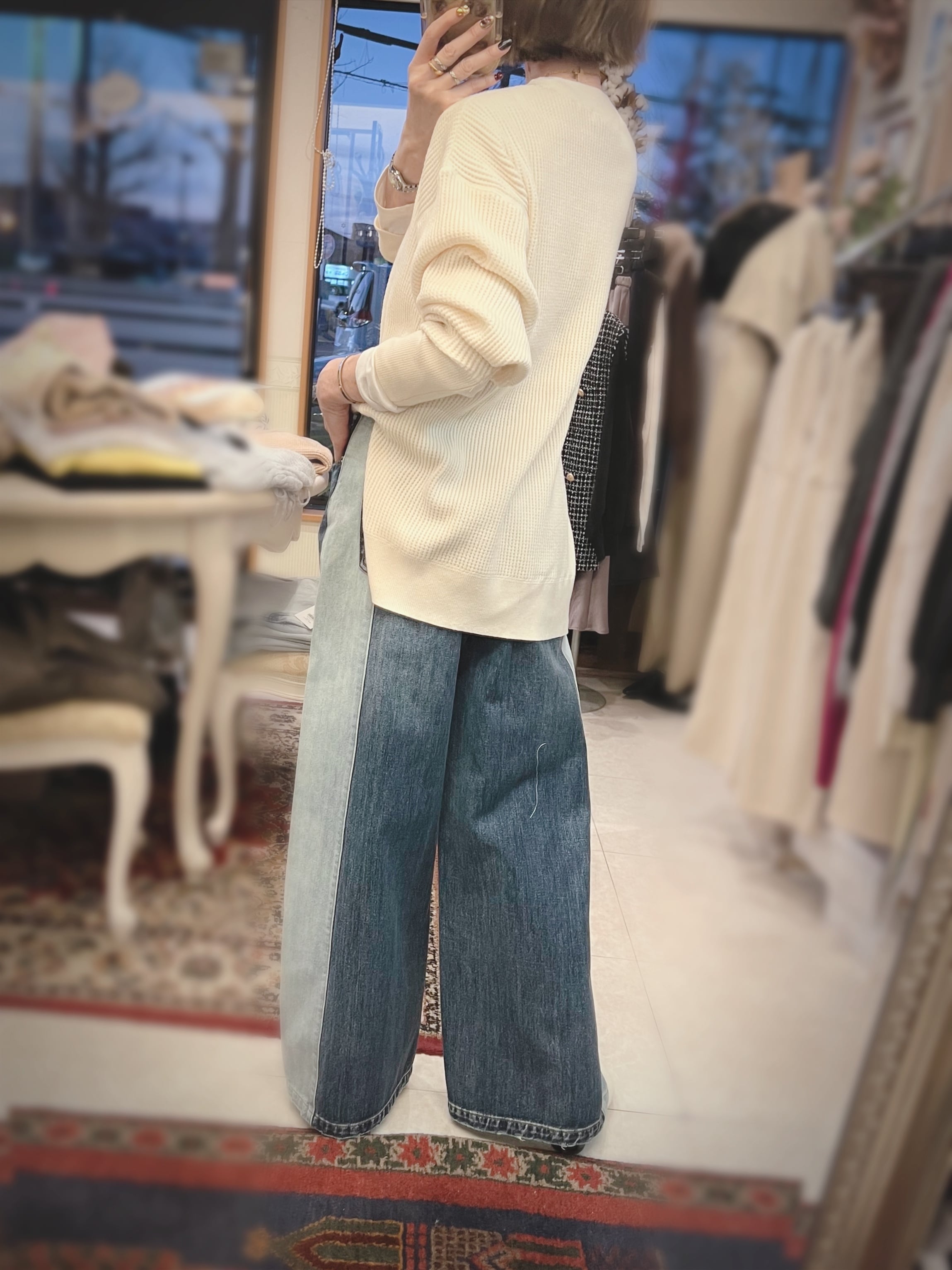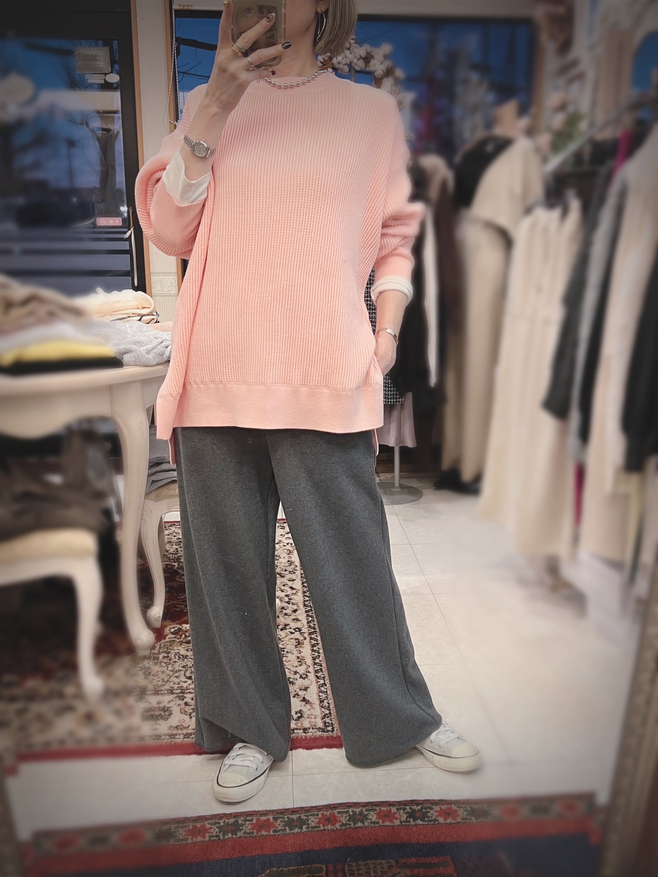 レーヨン混素材を使用しているので、とてもなめらかなタッチで、程よい落ち感が気持ち良いニットです。厚すぎない丁度良い肉感も◎。