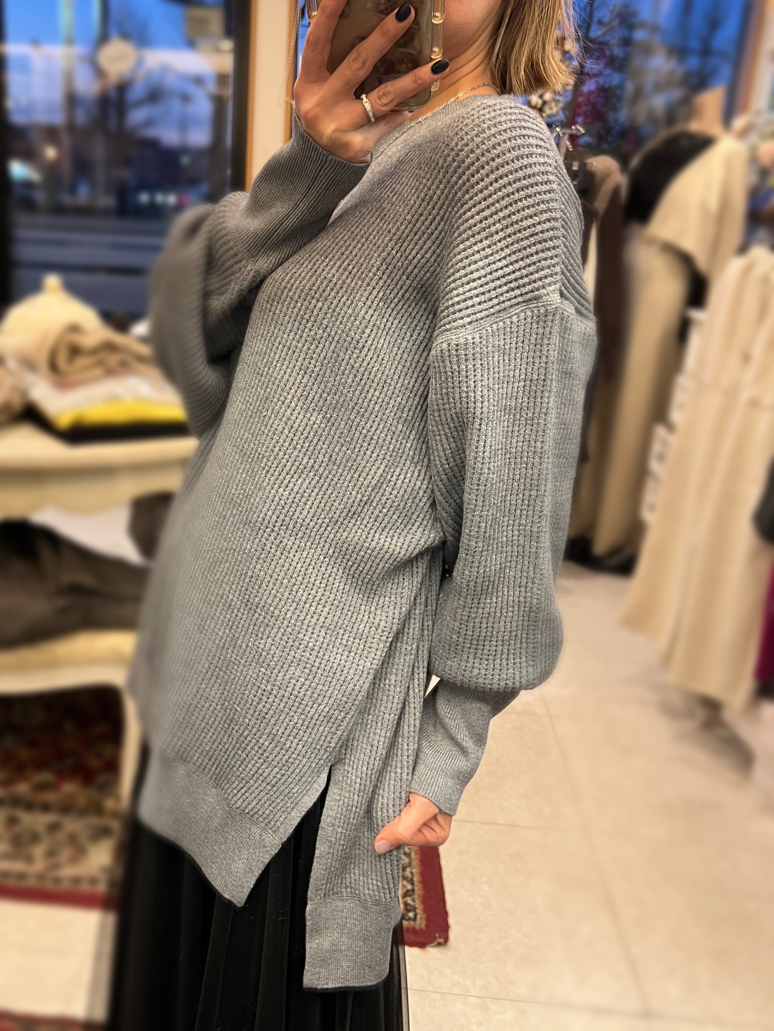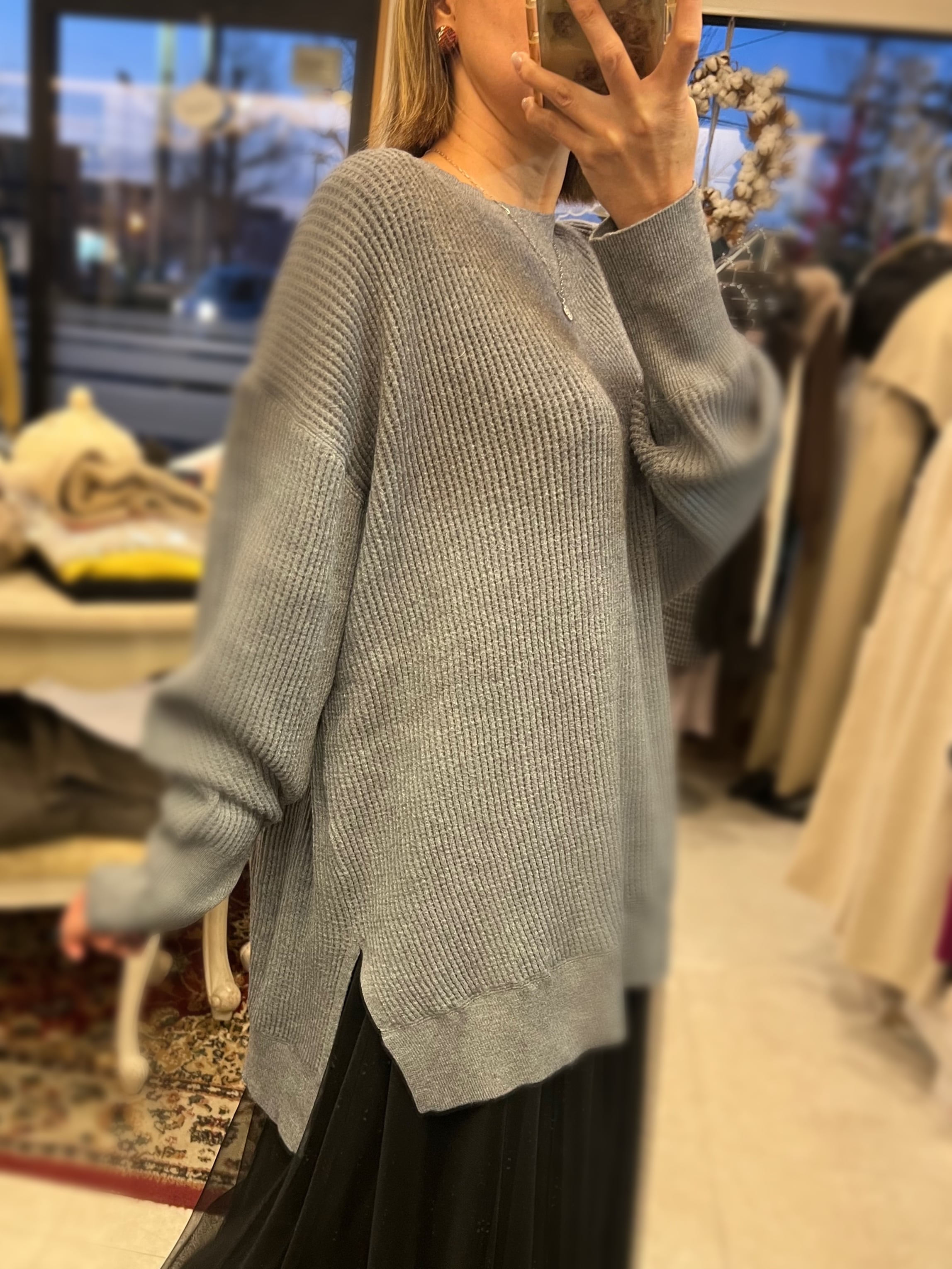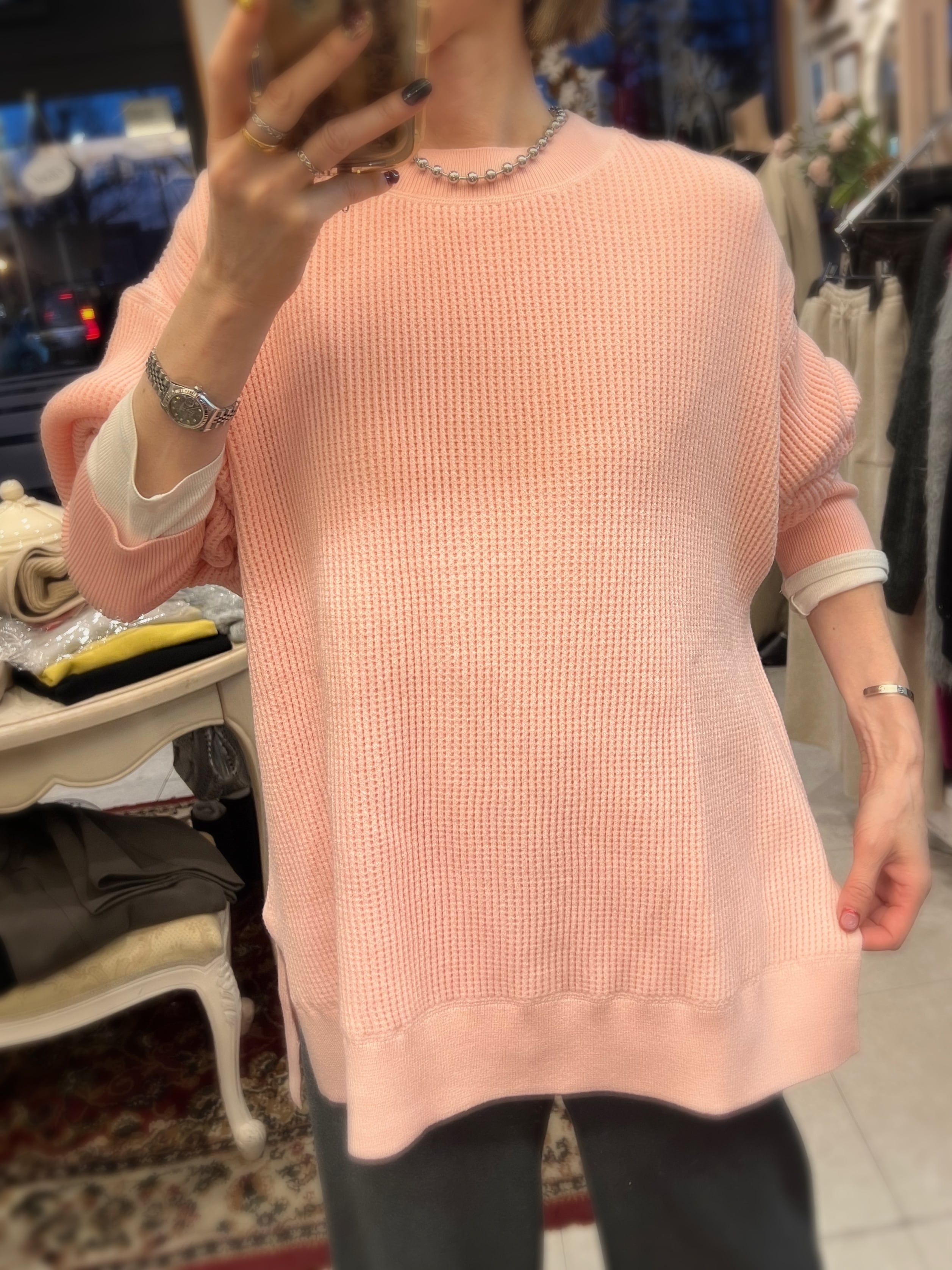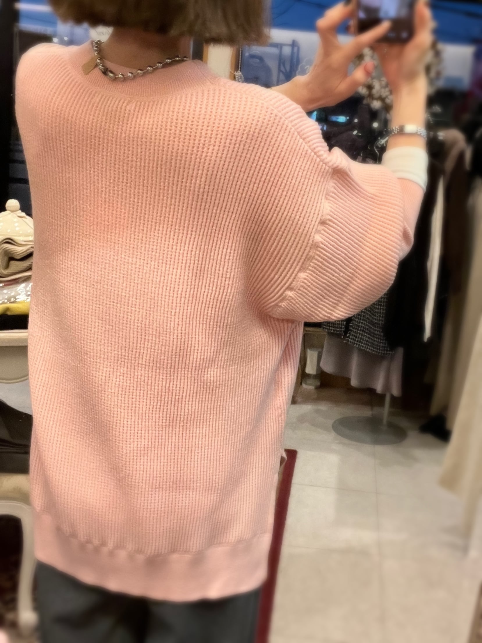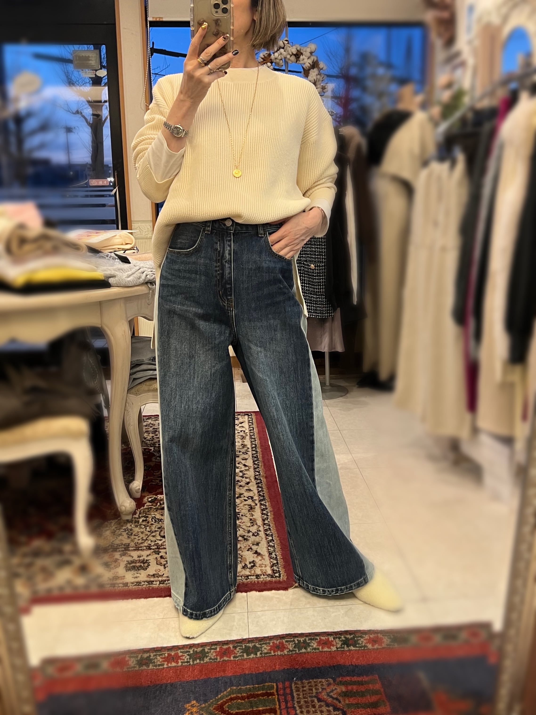 レーヨン混素材を使用しているので、とてもなめらかなタッチで、程よい落ち感が気持ち良いニットです。厚すぎない丁度良い肉感も◎。