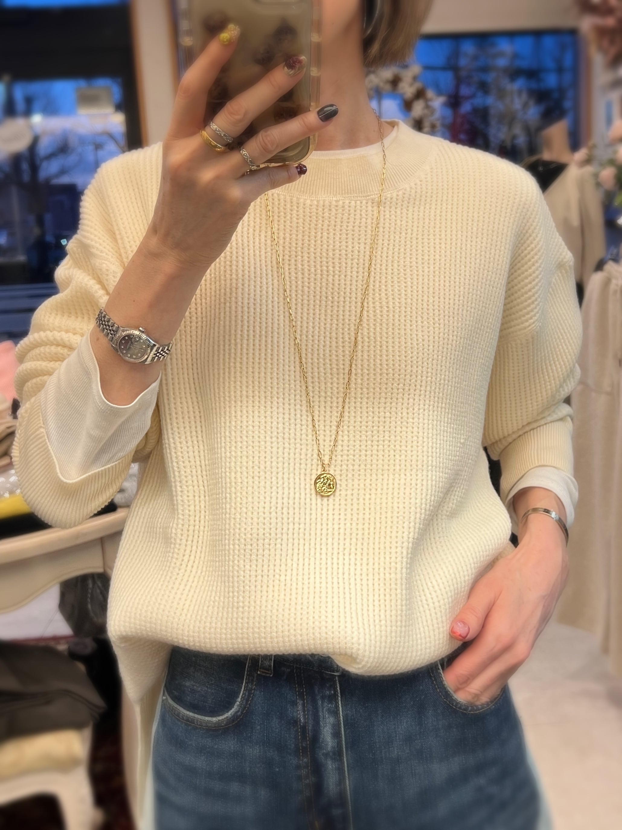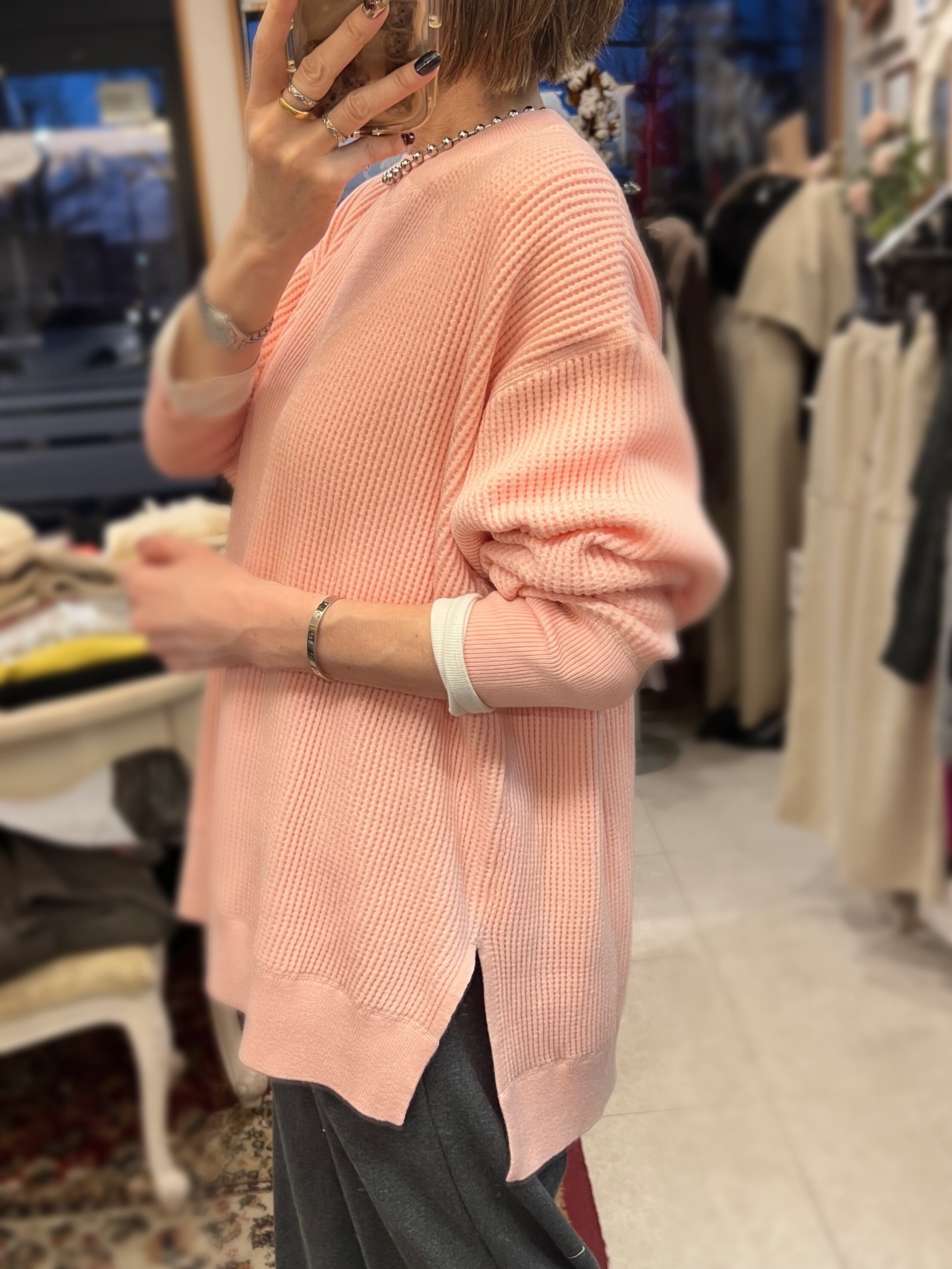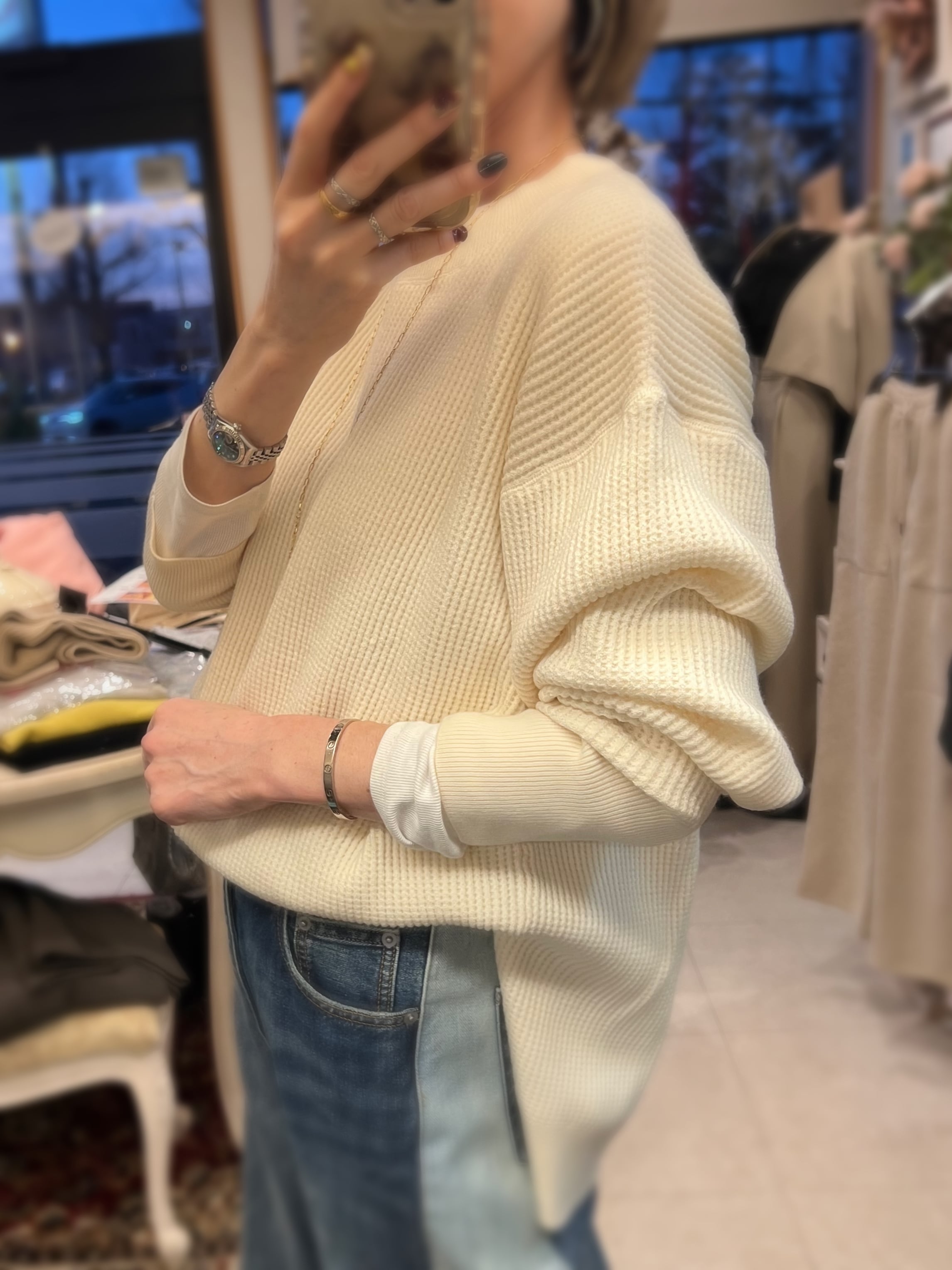 もちもちしたタッチが特徴の糸を使用したサーマル編みニットプルオーバー。