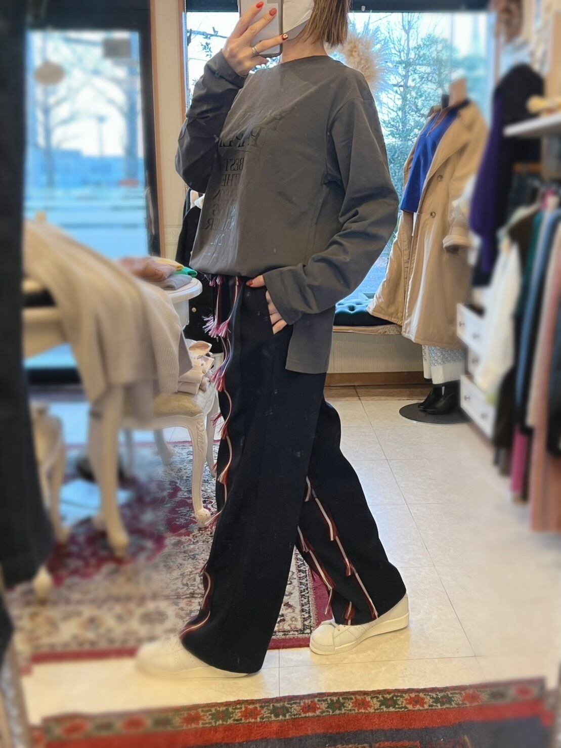 単色プリントに全体的に細いラインのフォントやラインで大人っぽく着用できるプリントTシャツになります。