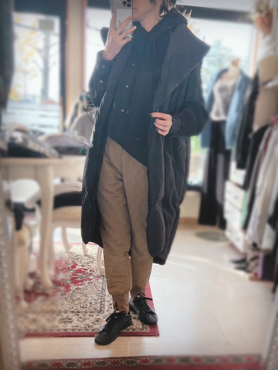 単調にならないようリブ編みで編立て、表情感を持たせました。フーディーのようにカジュアルに仕上げ、顔周りや首元を暖かく包み込んでくれる1着です。コーディネートのアクセントに。
