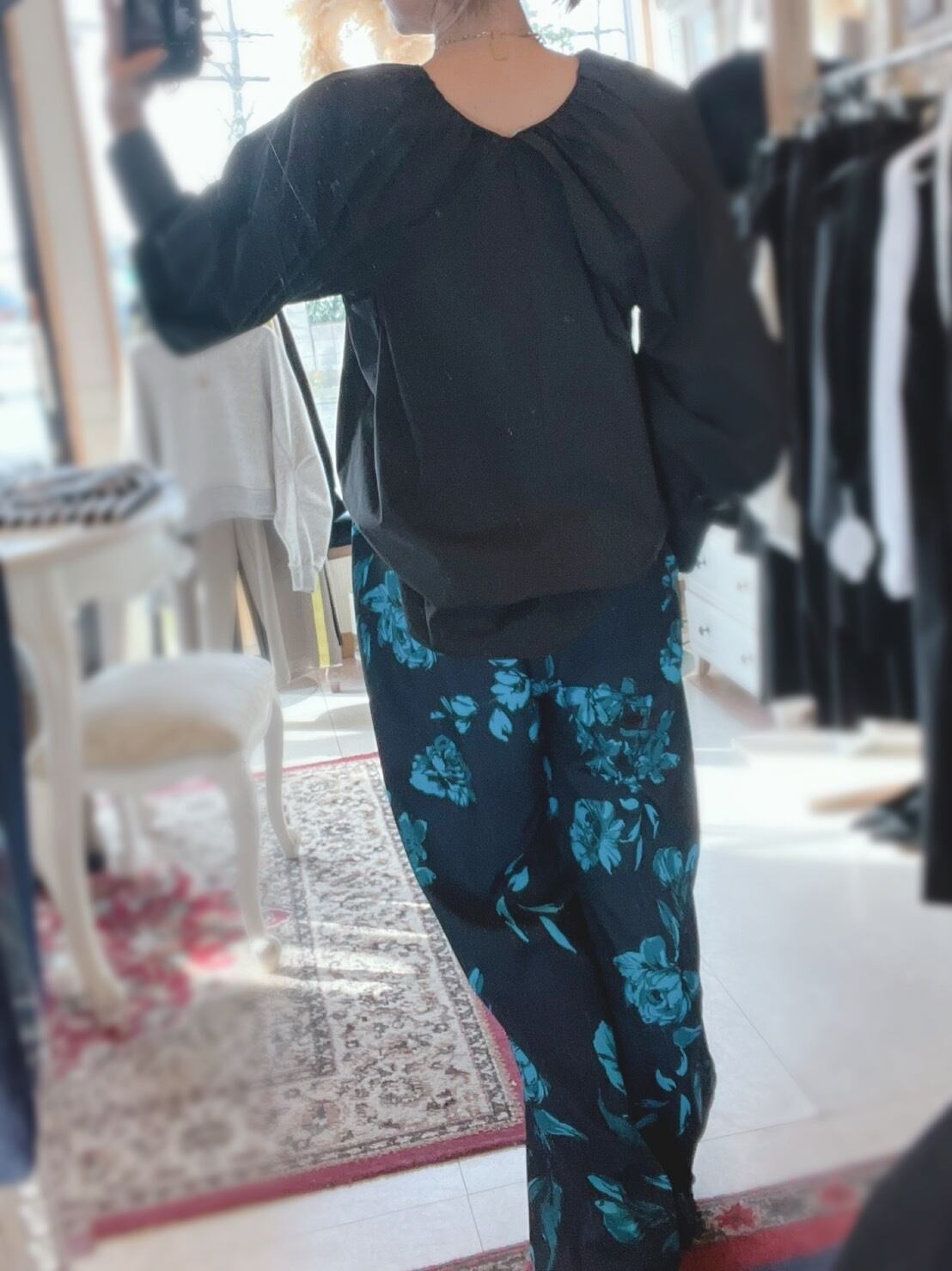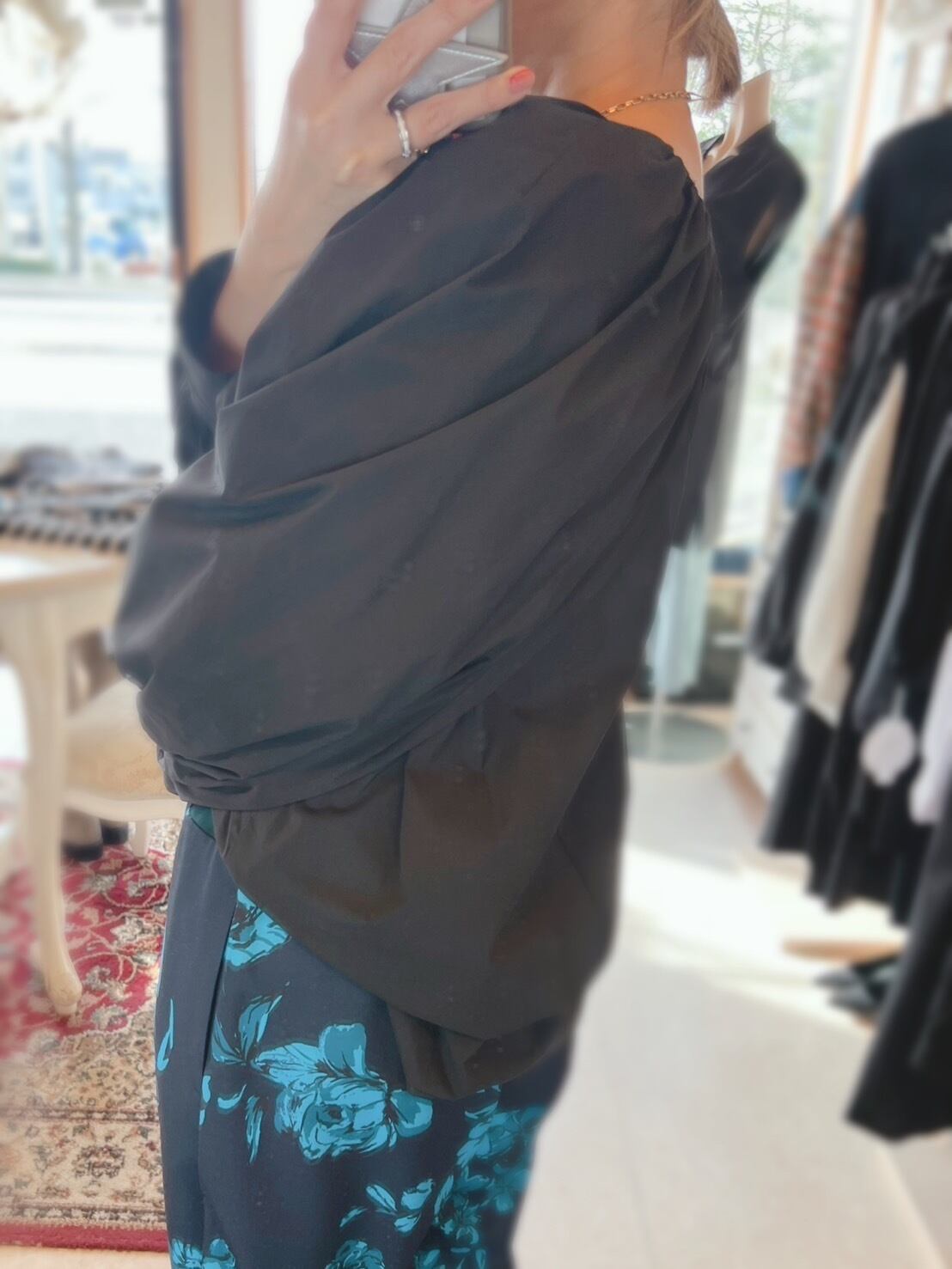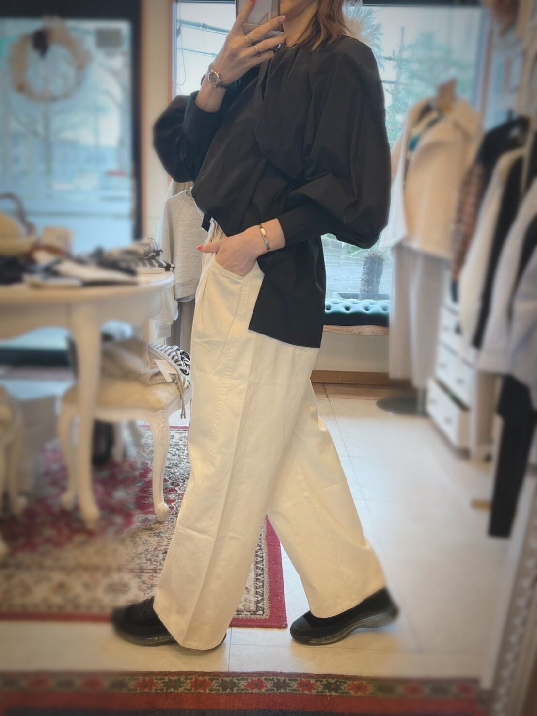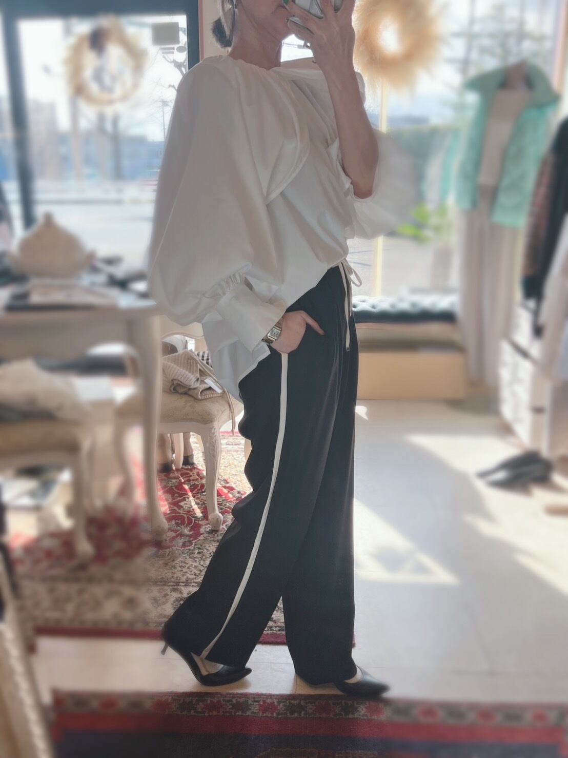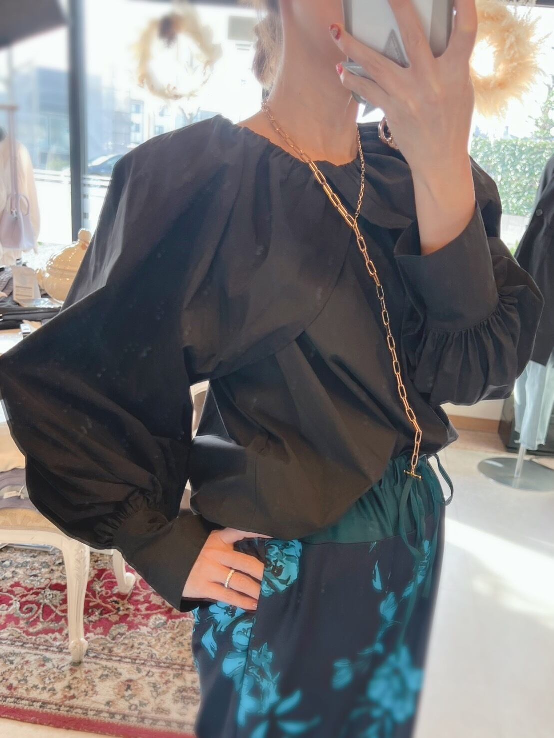 ケープの様なデザインの袖口にはたっぷりとギャザーを。衿ぐりには繊細なギャザーを寄せる事で、上品な印象のボリュームスリーブブラウスに仕上げています。
