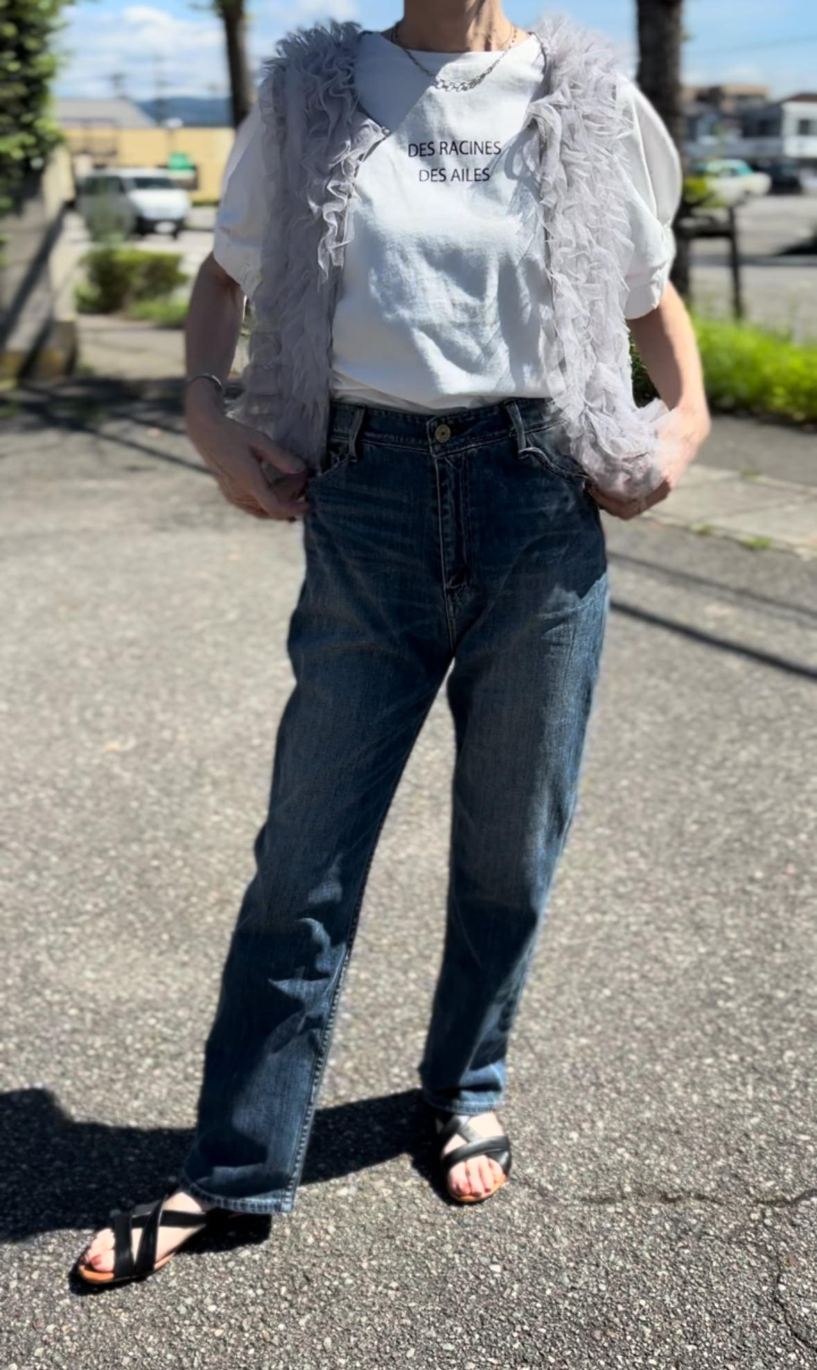 高いウエスト位置から足先に向けて直線的シルエットで構築したストレート。視覚効果で脚長見えし
