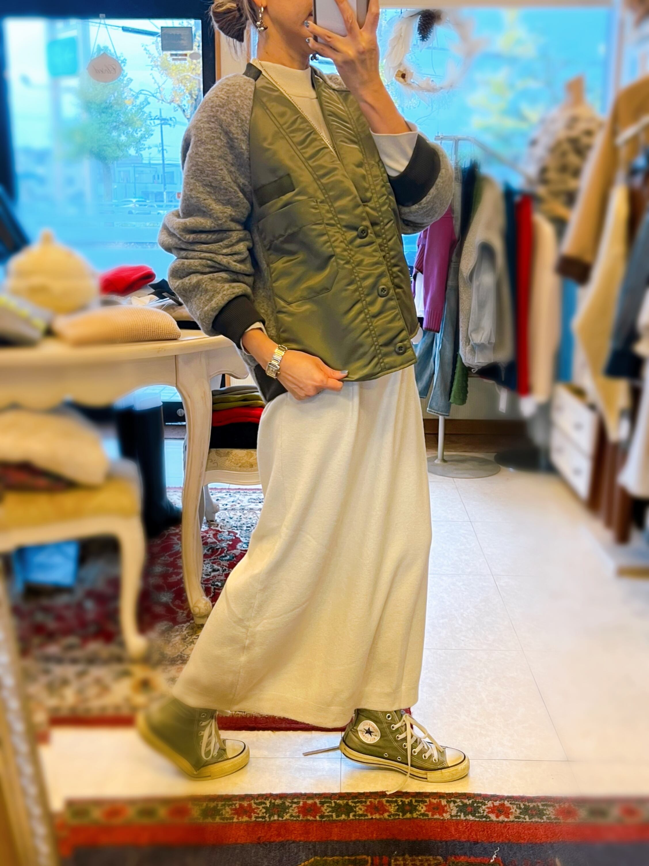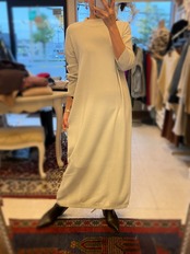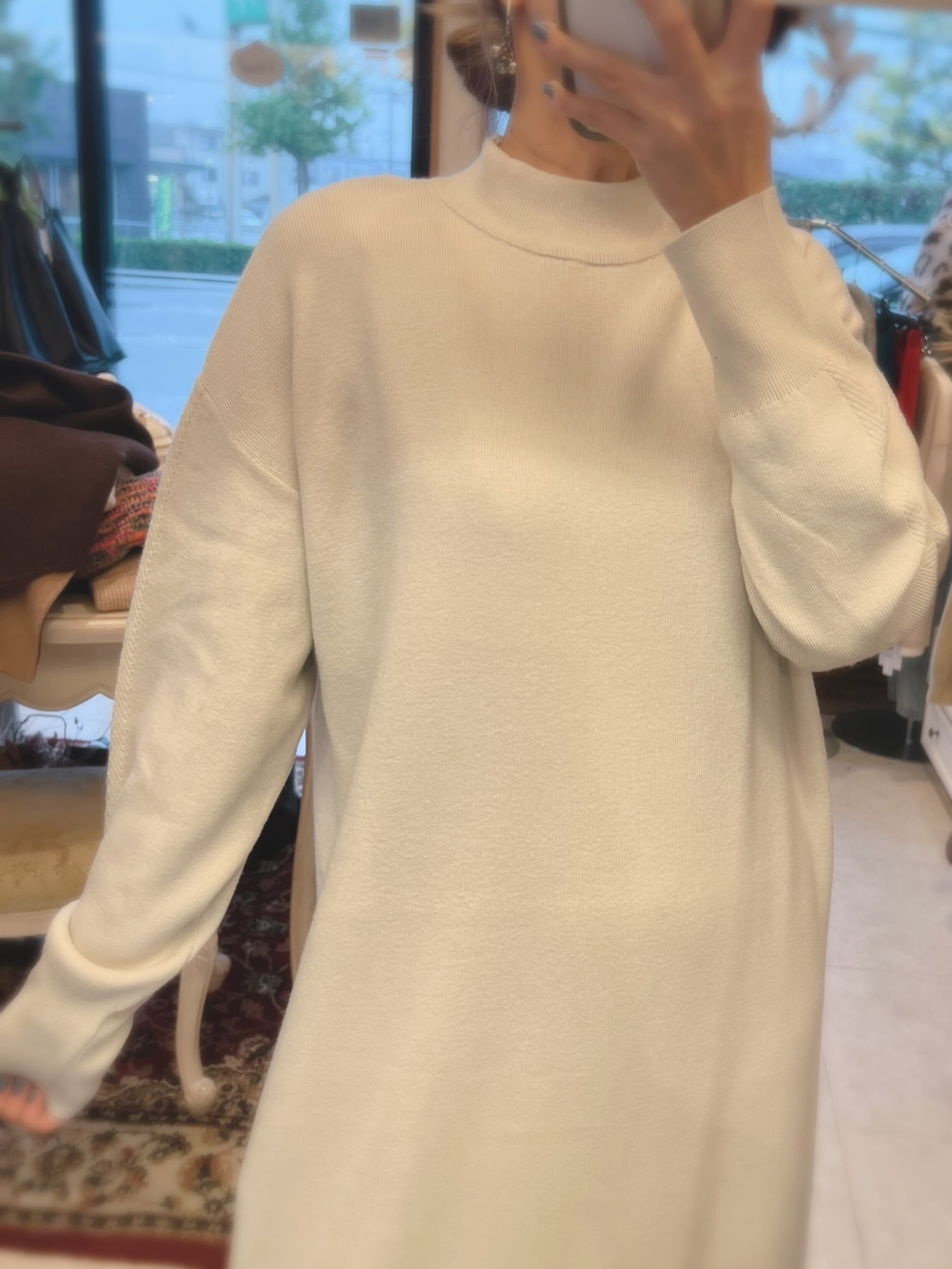 袖に同色で編み方変化でラインのようにしてありシンプルながらも小技ありのニットワンピース。サイズ感もゆるめなので着やすいです。